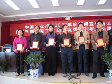 本報(bào)訊 日前,在云南省大理市召開(kāi)的中國(guó)工業(yè)報(bào)社2007年度新聞宣傳培訓(xùn)班暨第三屆中國(guó)工業(yè)企業(yè)優(yōu)秀報(bào)刊和好新聞?lì)I(lǐng)獎(jiǎng)大會(huì)上,我《杭機(jī)集團(tuán)報(bào)》被評(píng)為中國(guó)工業(yè)企業(yè)2007年度優(yōu)秀報(bào)刊一等獎(jiǎng),其獲獎(jiǎng)?wù)Z是:欄目豐富、形式活潑、文章短小精悍,并出版中德雙語(yǔ)報(bào),便于外籍專(zhuān)家了解企業(yè)動(dòng)態(tài)。本報(bào)記者陳烈新采寫(xiě)的《首席工程師加冕儀式在中科院杭州科技園舉行》報(bào)道,榮獲好新聞(消息)評(píng)選二等獎(jiǎng),這反映了我集團(tuán)重視人才隊(duì)伍建設(shè)引起了媒體的關(guān)注和肯定。集團(tuán)公司黨委書(shū)記董事長(zhǎng)朱金根獲悉,當(dāng)即給出席頒獎(jiǎng)會(huì)的主編王忠民發(fā)賀訊:“祝賀你,并與你們共享榮譽(yù)和喜悅!”
