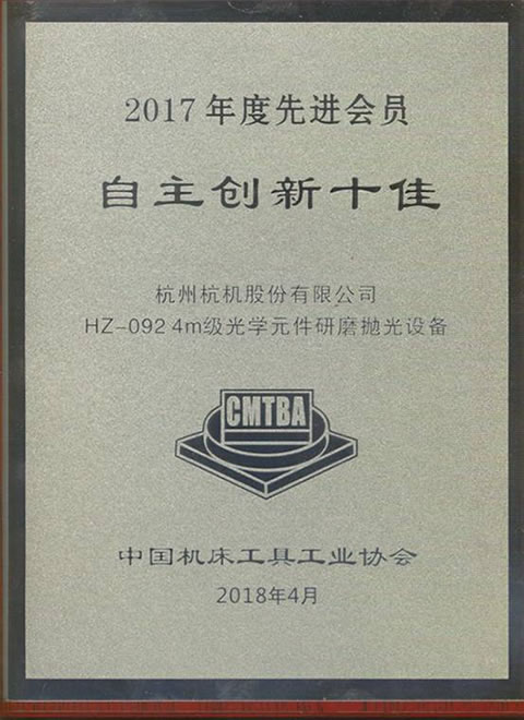 2018年4月,中國機(jī)床工具工業(yè)協(xié)會開展了2017年度中國機(jī)床工具工業(yè)協(xié)會先進(jìn)會員(十佳)表彰活動,我公司憑借“HZ-092 4米級光學(xué)元件研磨拋光設(shè)備”項(xiàng)目榮獲2017年度中國機(jī)床工具工業(yè)協(xié)會“自主創(chuàng)新十佳”稱號。