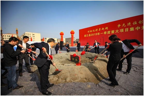 開工儀式在上午8點(diǎn)28分正式開始。浦江縣委書記程天云、浦江縣委副書記、縣長俞佩芬、浦江縣四套班子領(lǐng)導(dǎo)及各局委辦鄉(xiāng)鎮(zhèn)領(lǐng)導(dǎo)等300余人與浙江杭機(jī)董事長于立鵬、總經(jīng)理孫益民以及50多位杭機(jī)職工代表共同出席開工儀式。